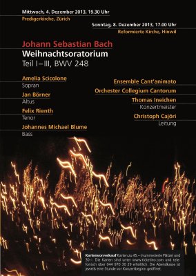 Sa, 08. Dez. 2018 19:00 Uhr - WeihnachtsoratoriumKirche Fluntern, Zürich Zürichsee-Chor J.S. Bach: Weihnachtsoratorium, Teil 1 - 3 |
