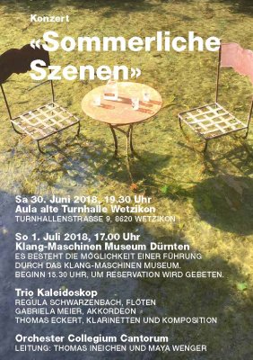 Sa, 30. Juni 2018 19:30 Uhr - Sommerliche SzenenAula alte Turnhalle, Wetzikon mit dem Trio Kaleidoskop: und dem Orchester Collegium Cantorum: Programm: