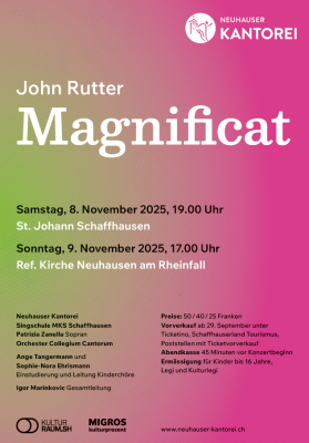 Sa, 08. Nov. 2025 17:00 Uhr - Neuhauser KantoreiJohn Rutter: Magnificat Neuhauser Kantorei Singschule MKS Schaffhausen Patricia Zanella, Sopran Orchester Collegium Cantorum Ange Tangermann und Sophie-Nora Ehrismann (Einstudierung und Leitung Kinderchöre) Gesamtleitung: Igor Marinkovic Kirche St. Johann Schaffhausen |