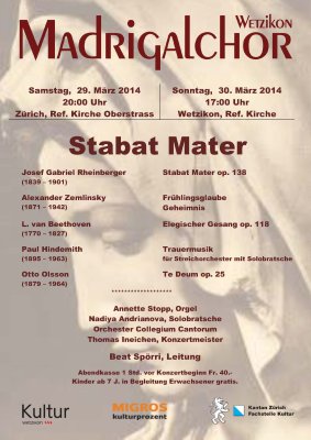 So, 02. Feb. 2020 17:00 Uhr - Antonín Dvorák: Stabat MaterRef. Kirche Hinwil Kantorei Zürcher Oberland Antonín Dvorák: Stabat Mater
