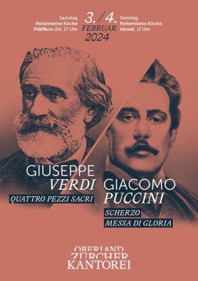 Sa, 03. Feb. 2024 17:00 Uhr - Kantorei ZO: Puccini und VerdiRef. Kirche Pfäffikon ZH Kantorei Zürcher Oberland Giuseppe Verdi: aus Quattro Pezzi Sacri: Laudi alla Vergine Maria, Ave Maria und Stabat Mater Giacomo Puccini: Scherzo a-moll für Streichorchester und Messa di Gloria |