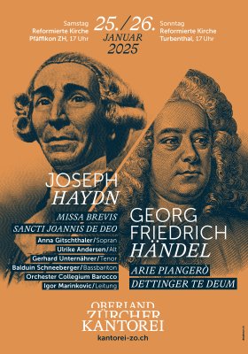 Sa, 25. Jan. 2025 17:00 Uhr - Kantorei ZO: Joseph Haydn und Georg Friedrich HändelReformierte Kirche Pfäffikon ZH Georg Friedrich Händel: Arie Piangerò aus Giulio Cesare in Egitto, HWV 17 Georg Friedrich Händel: Dettinger Te Deum HWV 283 |